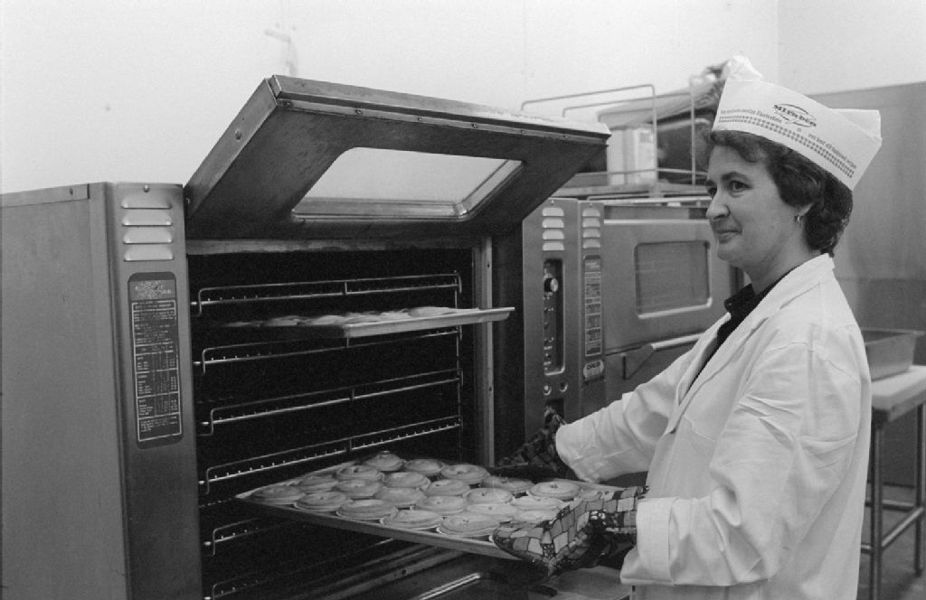 Cuisiniers au travail et quartiers de boeufs suspendus. Cuisine Mirabon. Saint-Jérôme, 1980, Archives nationales à Montréal, Fonds Ministère de la Culture et des Communications, (06M,E6,S7,SS1,D800575-800575), Adrien Hubert.