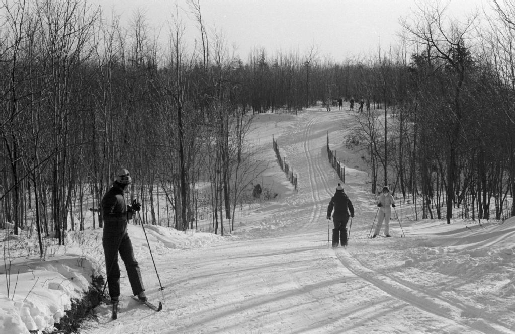 - Sportifs participant à une activité de ski de fond. On remarque les sentiers et un pont en bois. De plus, le directeur prononce une allocution en compagnie de dignitaires. Ces photographies ont été créées pour Colette Larin du ministère du Travail, de la Main-d'oeuvre et de la Sécurité du revenu, Direction des communications