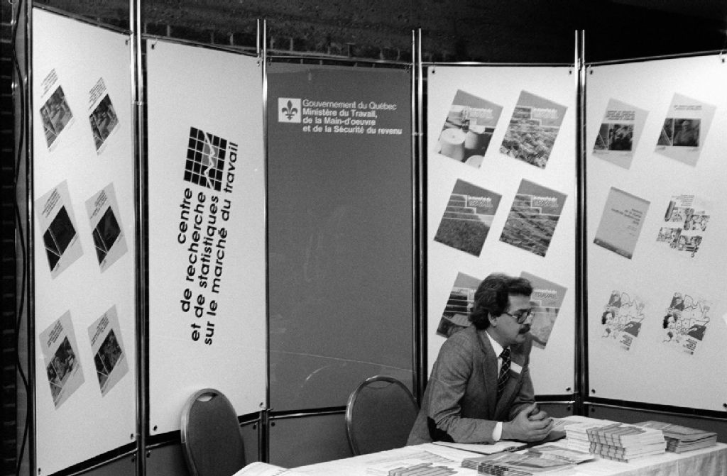 - Nous remarquons, en plus des conférenciers, un stand du Centre de recherche et de statistiques sur le marché du travail. Nous voyons aussi une préposée présenter une brochure intitulée «Relations du travail». Ces photographies ont été commandées par Jean Dion du ministère du Travail, de la Main-d'oeuvre et de la Sécurité du revenu
