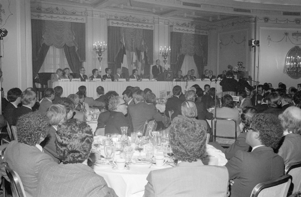- Conférence qui se déroule avec, entre autres, le ministre français Michel Jobert. Nous remarquons les conférenciers réunis en table ronde. Ces clichés ont été demandés par Luciano Dorotéa du ministère des Affaires intergouvernementales