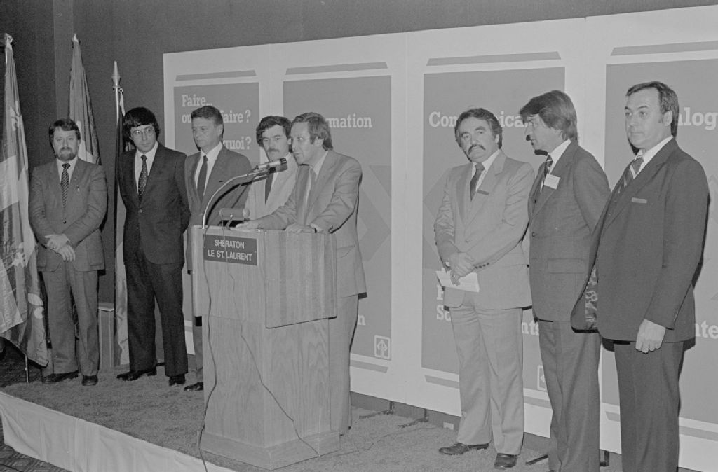 - Il s'agit d'un salon sur les métiers. Nous remarquons des orateurs prononçant des allocutions. De plus, nous voyons les stands du Centre de recherche Industrielle du Québec (CRIQ), de la United Technologies Pratt & Withney Aircraft of Canada et du ministère de l'Industrie, du Commerce et du Tourisme du Québec. Ces photographies ont été commandées par Éliane Denicolloni du ministère de l'Industrie, du Commerce et du Tourisme, Service des communications
