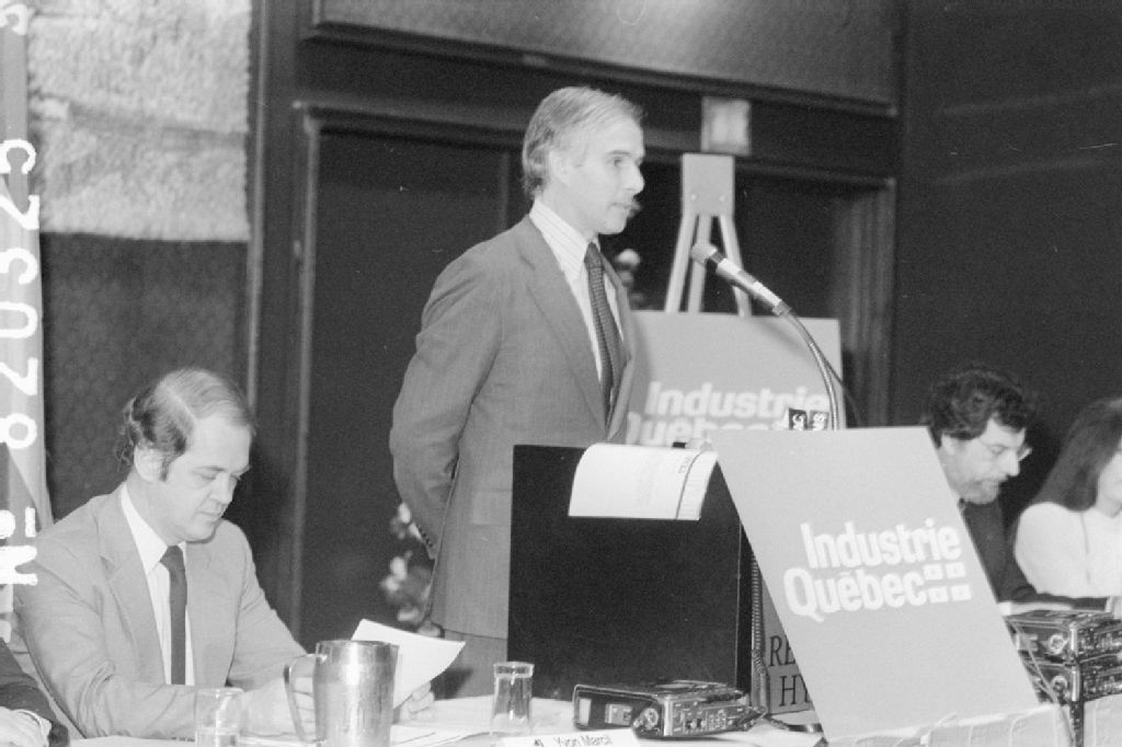 Conférence de presse du ministre Rodrigue Biron. Hôtel Régence Hyatt, salle Cartier, Montréal, 6 décembre 1982, Archives nationales à Montréal, Fonds Ministère de la Culture et des Communications, (06M,E6,S7,SS1,D820325-820325), Henri Rémillard.