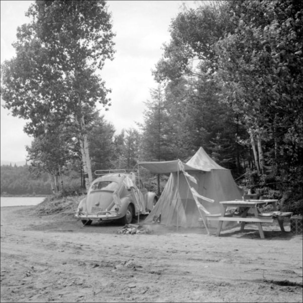 - Des familles profitent du terrain de camping au lac Chat dans le parc du Mont-Tremblant. Nous remarquons les tentes, les roulottes et les voitures. Des travaux de défrichage sont probablement en cours entre les lacs Chat et Monroe. Dossier commandé par le ministère du Tourisme, de la Chasse et de la Pêche, Service d'aménagement de la faune