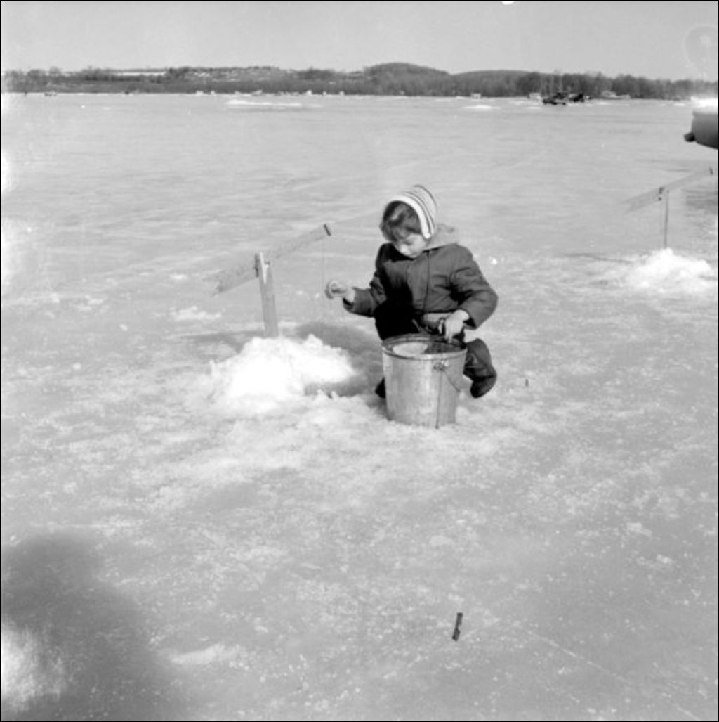 - Des familles s'adonnent à la pêche sur glace à la baie de Carillon et vérifient l'installation des brimbales. Une jeune fille exhibe une perchaude (64-15-11). Le dossier comprend également le cliché d'un paysage hivernal à Oka