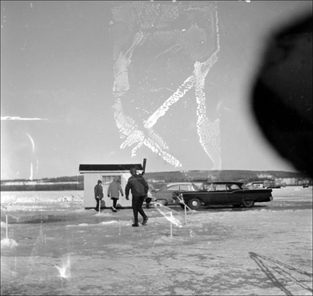 - Il s'agit de clichés représentant la pêche sous la glace (60-4-2 et 60-4-3) ainsi qu'un derby de pêche au lac Maskinongé (60-4-6 et 60-4-8 à 60-4-10) à Saint-Gabriel-de-Brandon. Nous apercevons les cabanes, l'équipement de pêche, les voitures et les éperlans capturés (64-4-3). Le dossier comprend également une image de la cabine de l'Association de chasse et pêche de Saint-Gabriel