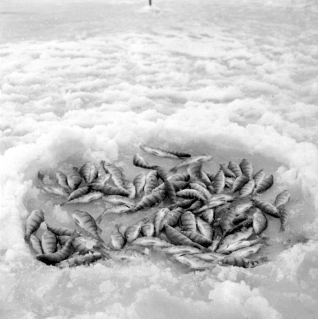 - Des familles s'adonnent à la pêche sur glace près de Longueuil (67-201-3) et à la baie Missisquoi où elles ont capturé des perchaudes (67-201-1, 67-201-2 et 67-201-4). Des motoneigistes comptabilisent les prises (67-201-5 et 67-201-6). Un bonhomme de neige monte la garde près d'une clôture de pointe Jameson (67-201-7). Le dossier comprend également des clichés montrant des verveux utilisés pour la pêche à la lotte à Notre-Dame-de-Pierreville (67-201-8 et 67-201-9) et des maisons de pierre des champs situées à Verchères (67-201-10 à 67-201-12). Dossier commandé par le ministère du Tourisme, de la Chasse et de la Pêche, Service d'aménagement de la faune