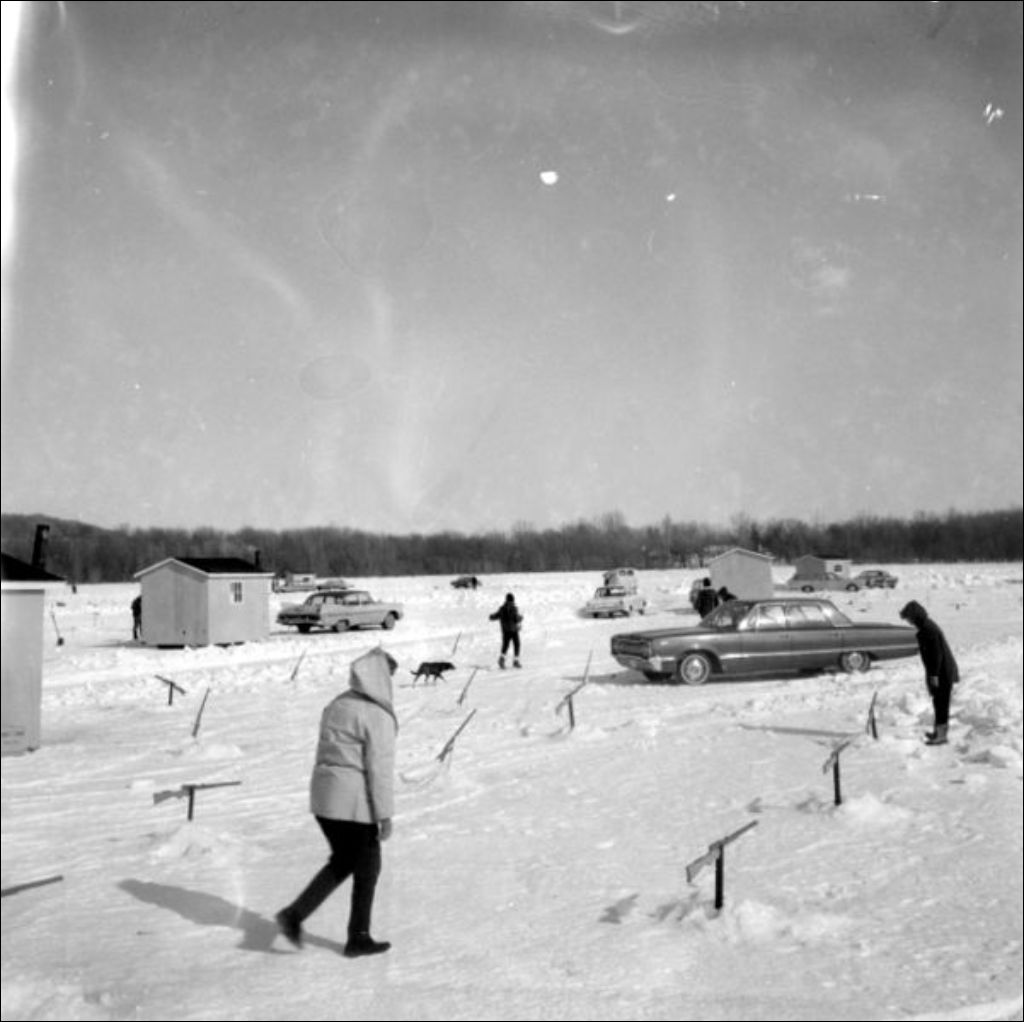 - Des familles s'adonnent à la pêche sur glace à la baie de Carillon. Un enfant exhibe sa prise de la journée, un crapet calicot. Nous retrouvons aussi des perchaudes. Nous remarquons les installations, les cabanes et l'équipement de pêche. Dossier commandé par le ministère du Tourisme, de la Chasse et de la Pêche, Service d'aménagement de la faune