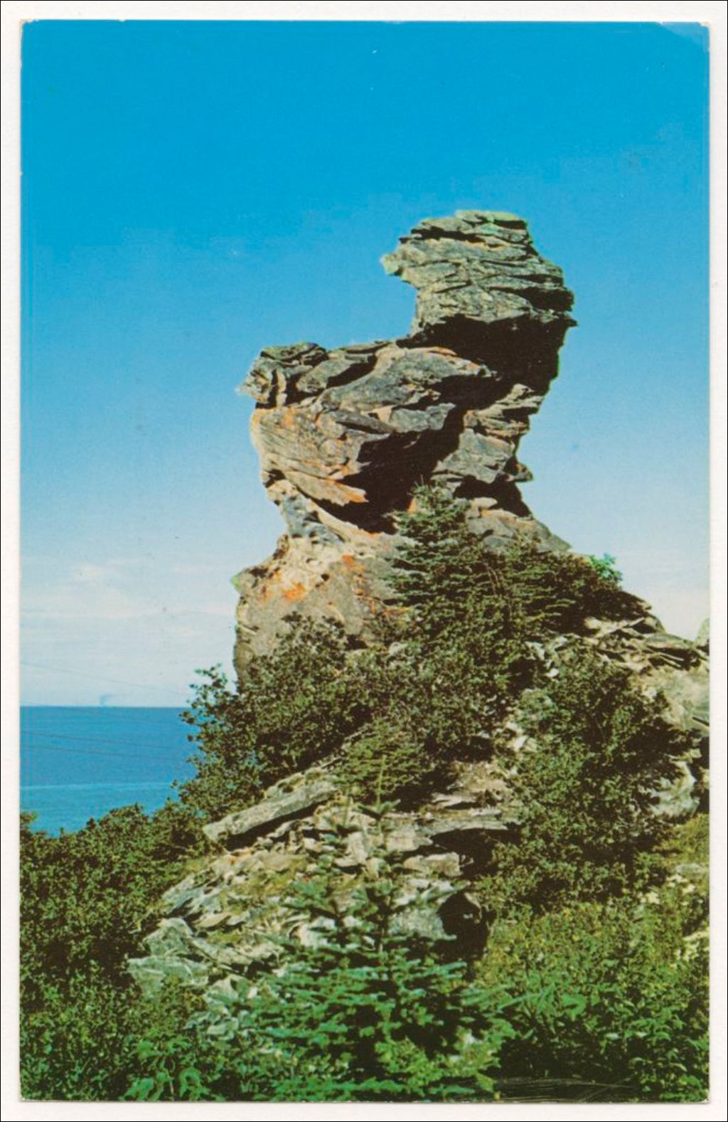 In the Scenic Gaspe Peninsula, P.Q. : cette fort interessante formation géologique peut être vue près du phare à l'extrémité ouest du village = this most interesting Rock formation may be seen near the Lighthouse at western end of the village : Rocher Chat = the Rock cat at Cap Chat, Gaspé Nord, Route 6, P.Q.