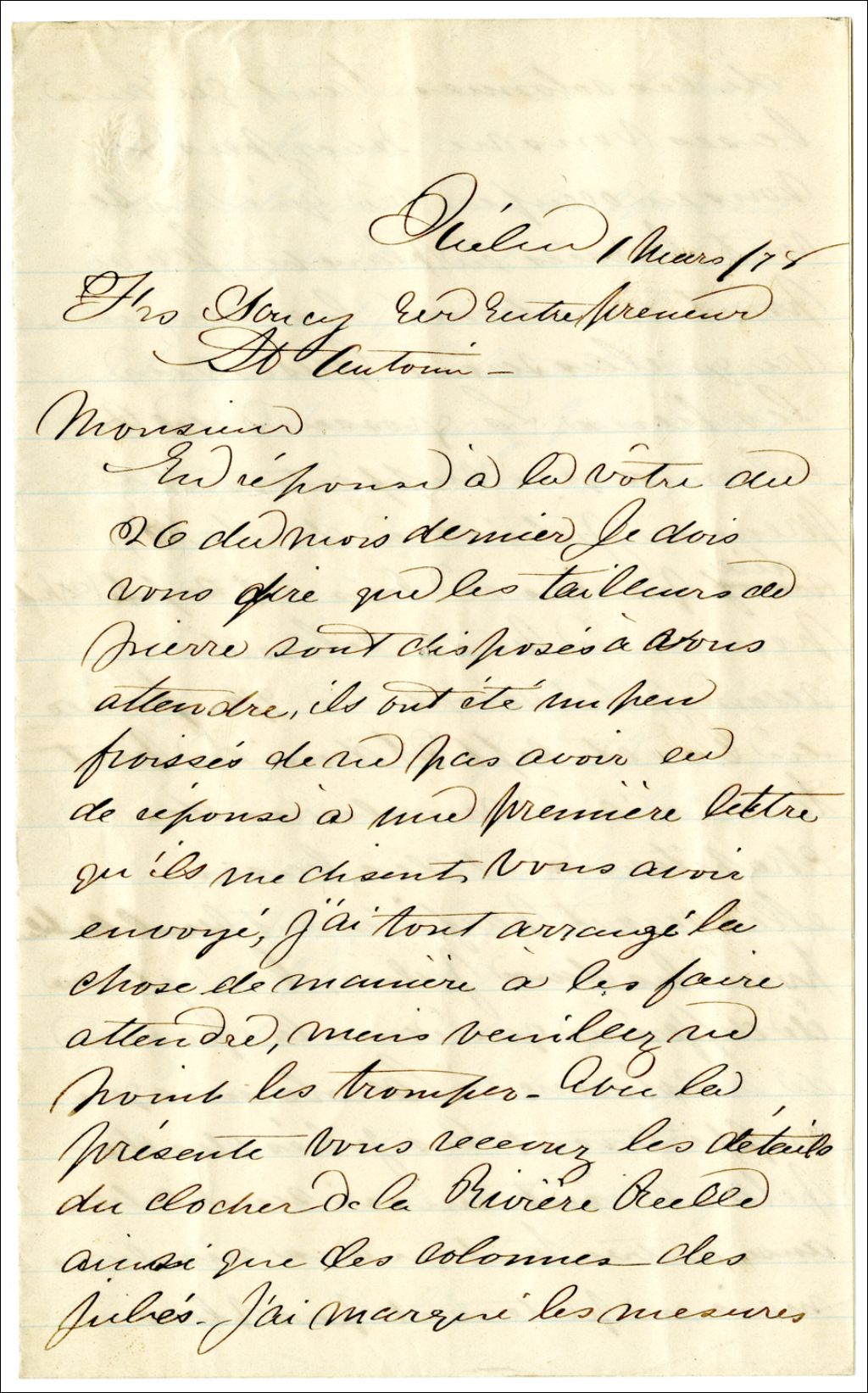 Lettre de David Ouellet à François Soucy concernant un retard dans les travaux et des détails de construction, 1 mars 1878, Archives nationales à Rimouski, Fonds David Ouellet, (01R,P56,D1,P2).