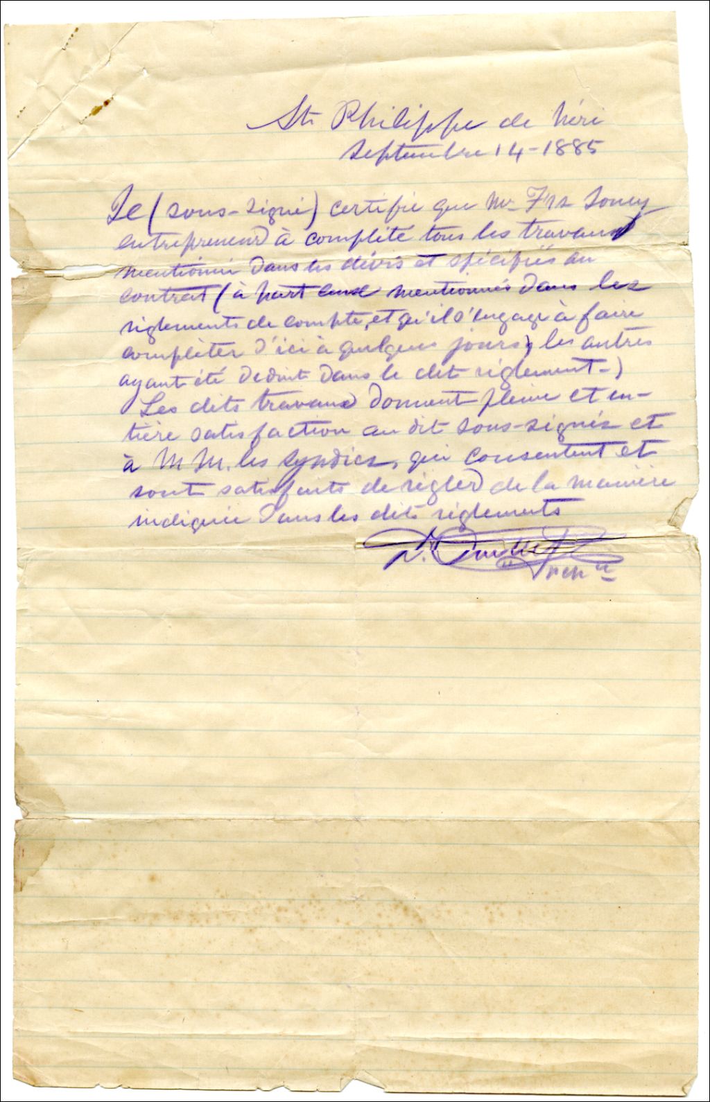 Mémo d'acceptation des travaux avec consentement de règlement et note illustrant les sommes à payer, rédigés par David Ouellet, 14 septembre 1885, Archives nationales à Rimouski, Fonds David Ouellet, (01R,P56,D2,P11).