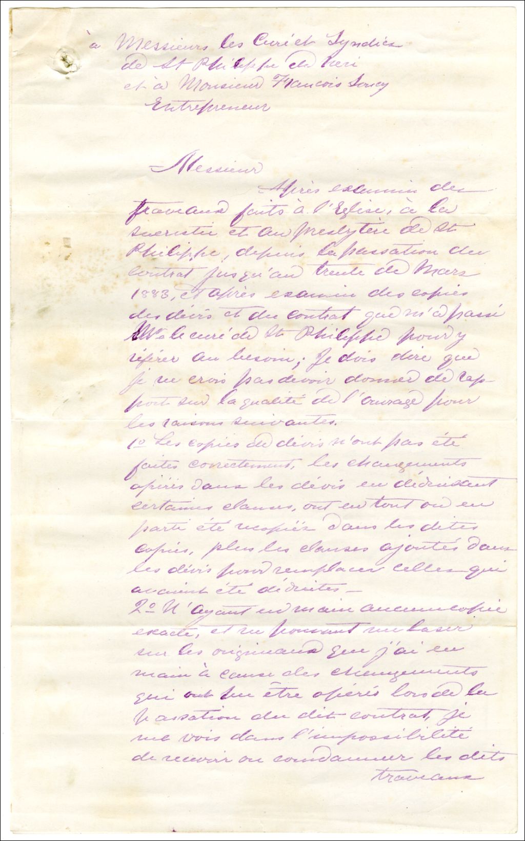 Opinion de David Ouellet sur une demande de rapport concernant la qualité des travaux faits à l'église, à la sacristie et au presbytère de Saint-Philipe-de-Néri - Adressée au curé, aux syndics et à l'entrepreneur