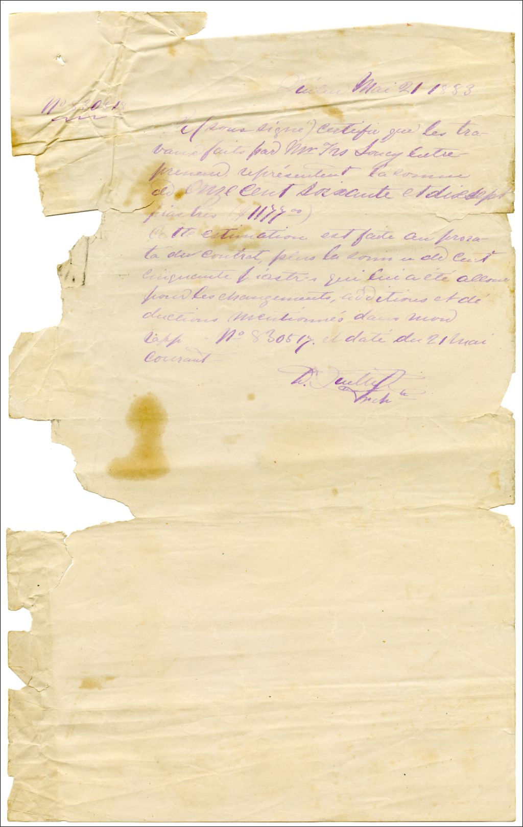 Nouvel estimé des travaux en cours par David Ouellet, 21 mai 1883, Archives nationales à Rimouski, Fonds David Ouellet, (01R,P56,D2,P5).