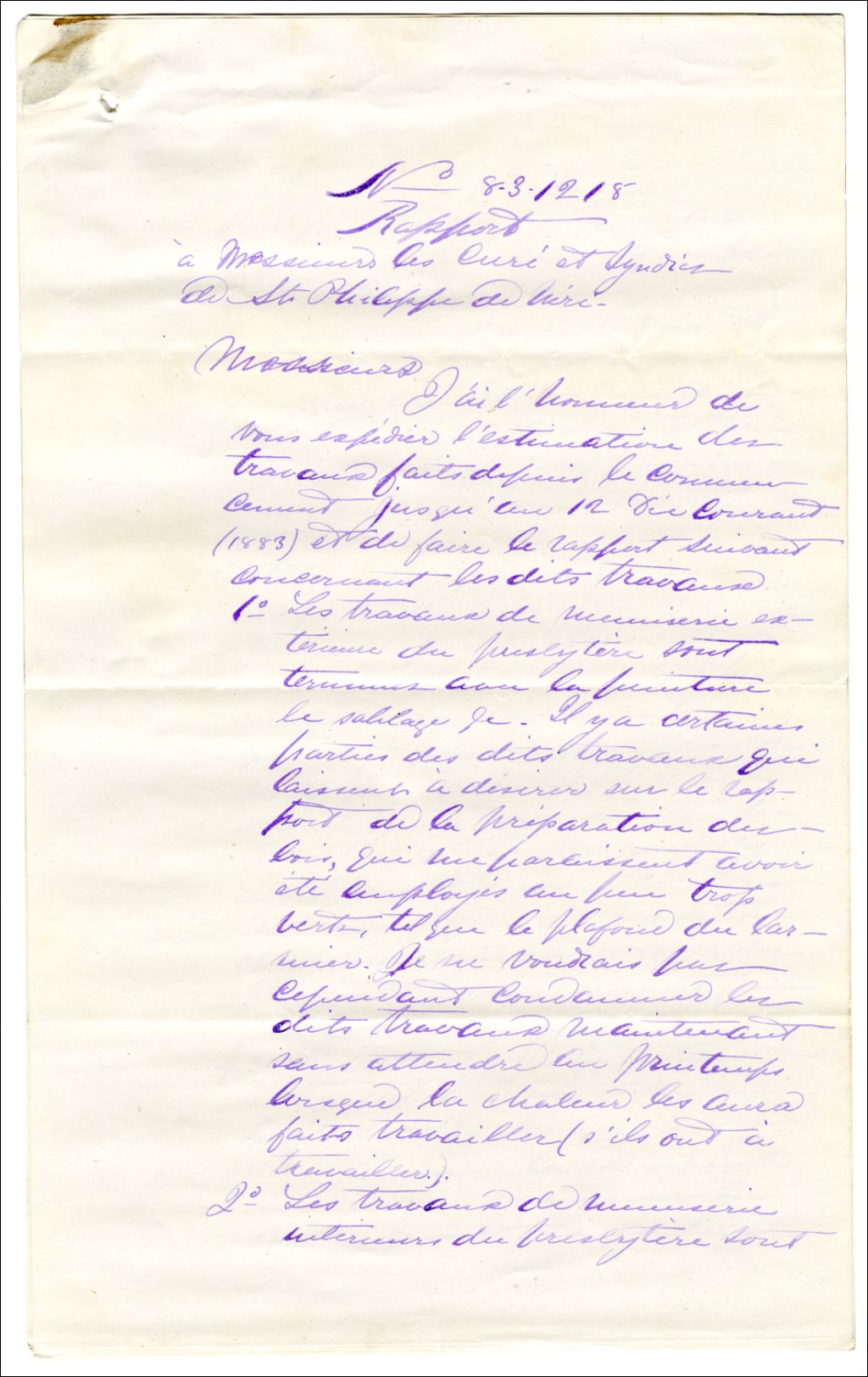 Rapport de David Ouellet sur l'avancement et la qualité des travaux effectués au presbytère et au clocher