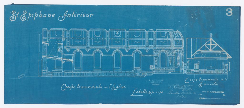 Coupe transversale de l'intérieur de l'église et sacristie, feuillet 3