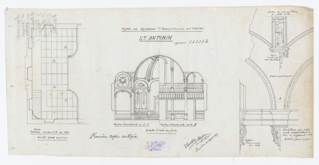 Section transversale du jubé vue de la nef, section horizontale du jubé, sections transversales du choeur et des petites voûtes, 23 août 1889, Archives nationales à Rimouski, Fonds David Ouellet, (01R,P56,D5,P3), Photographe non identifié.