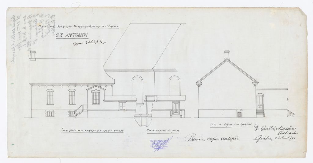 Longs pans de la sacristie et du chemin couvert, vue du pignon de la sacristie, 23 août 1889, Archives nationales à Rimouski, Fonds David Ouellet, (01R,P56,D5,P5), Photographe non identifié.