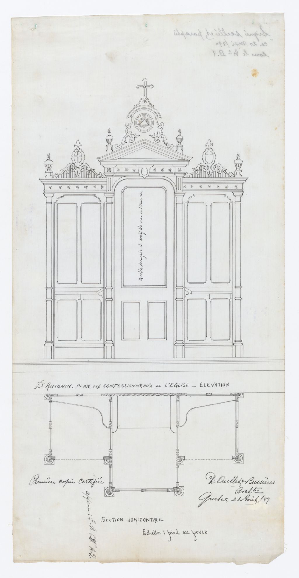 Plan des confessionnaux : section horizontale et élévation, 23 août 1889, Archives nationales à Rimouski, Fonds David Ouellet, (01R,P56,D5,P7), Photographe non identifié.