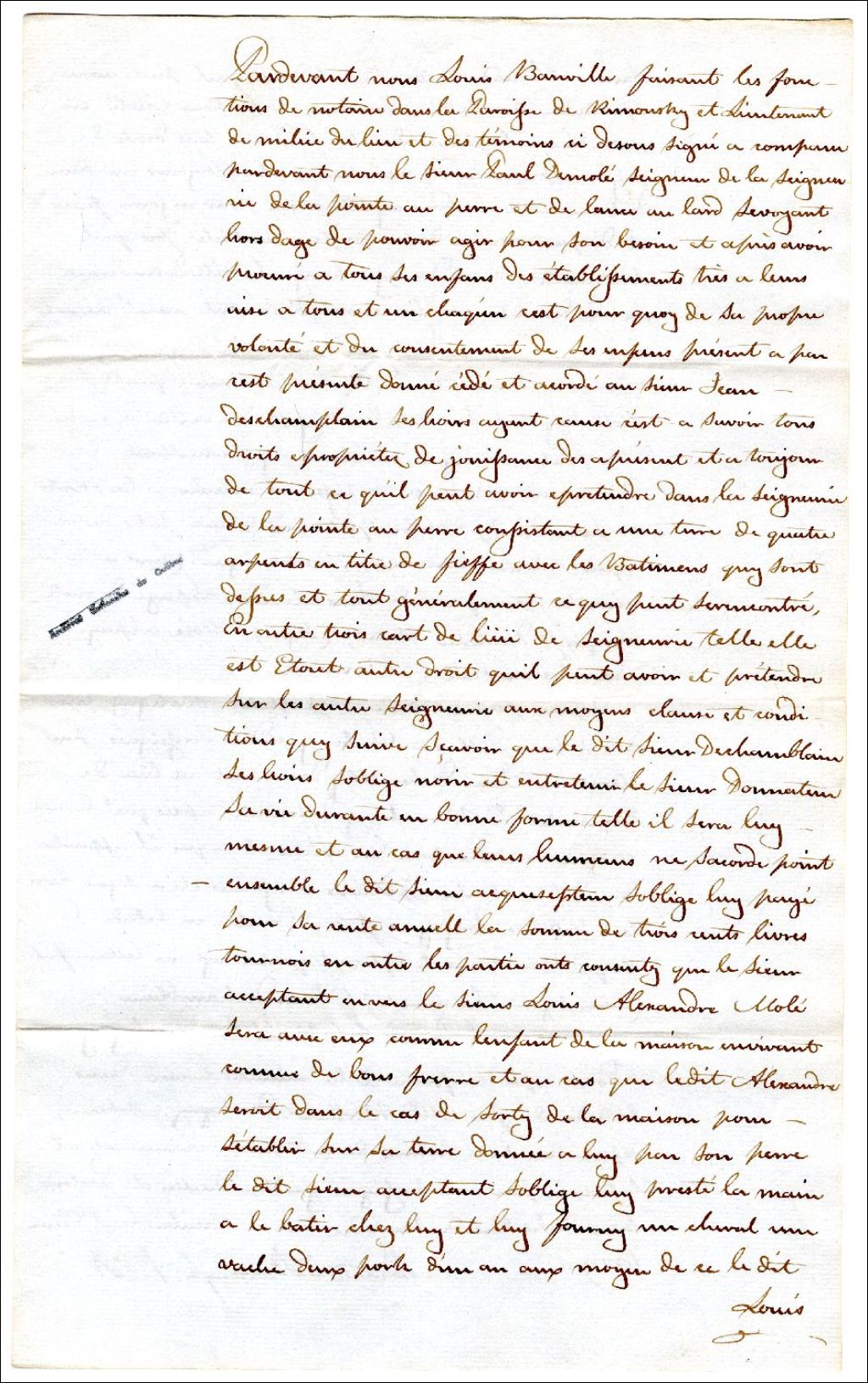 Copie d'acte de dépôt de donation faite le 29 juin 1781 par Sieur Paul de la Mole à Jean Dechamplain, 2 mai 1829, Archives nationales à Rimouski, Fonds Famille Tessier, (01R,P1,S10,P106).