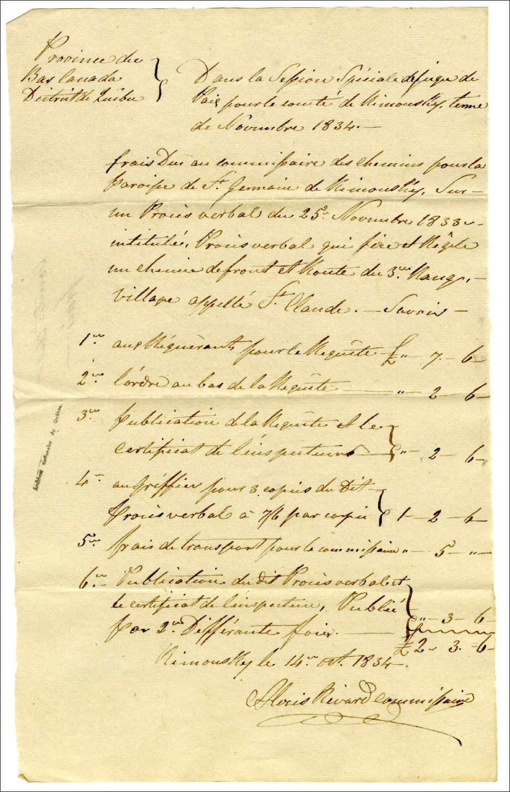 Frais du commissaire des chemins pour la paroisse de Saint-Germain de Rimouski, 14 octobre 1834, Archives nationales à Rimouski, Fonds Famille Tessier, (01R,P1,S10,P121).