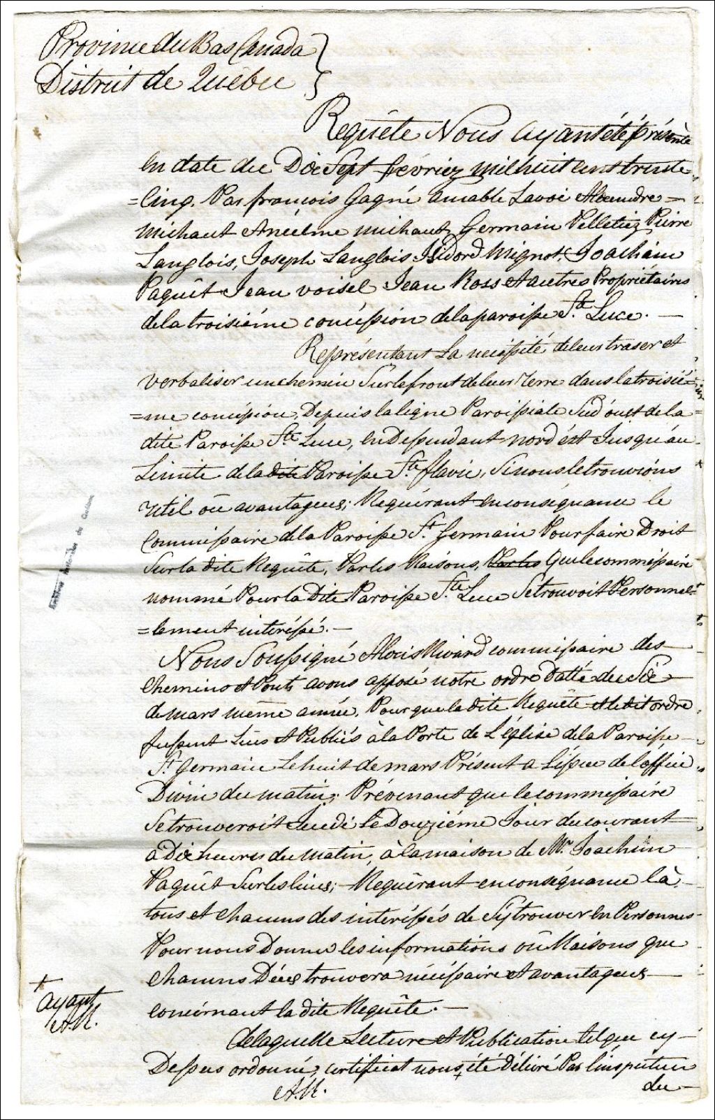Procès-verbal du chemin de front de la troisième concession de la paroisse Sainte-Luce, 14 mars 1835, Archives nationales à Rimouski, Fonds Famille Tessier, (01R,P1,S10,P125).