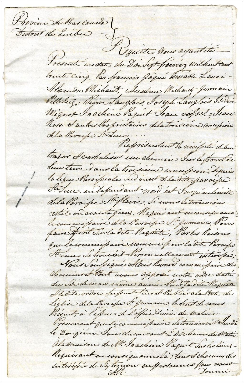 Procès-verbal du chemin de front de la troisième concession de la paroisse Sainte-Luce, 14 mars 1835, Archives nationales à Rimouski, Fonds Famille Tessier, (01R,P1,S10,P127).
