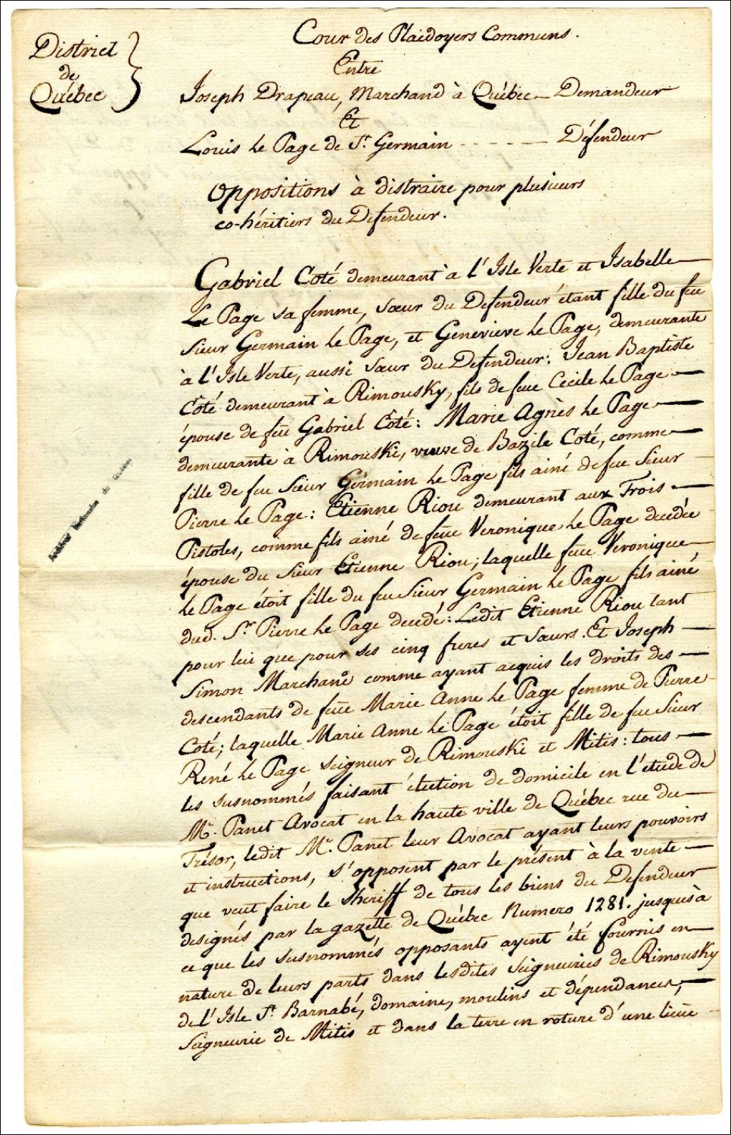 Cour des Plaidoyers Communs entre Joseph Drapeau, marchand de Québec, demandeur et Louis LePage de Saint-Germain, défendeur. Oppositions à distraire pour plusieurs co-héritiers du Défendeur, 26 juin 1790, Archives nationales à Rimouski, Fonds Famille Tessier, (01R,P1,S10,P13).