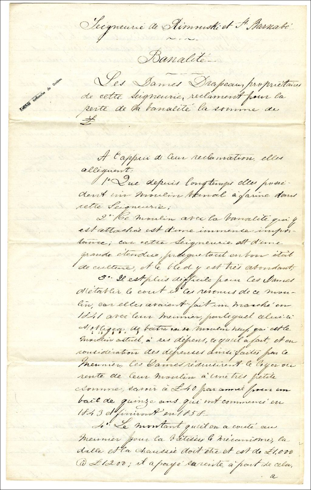 Réclamation des Dames Drapeau pour la perte de banalité pour la seigneurie de Rimouski et Saint-Barnabé