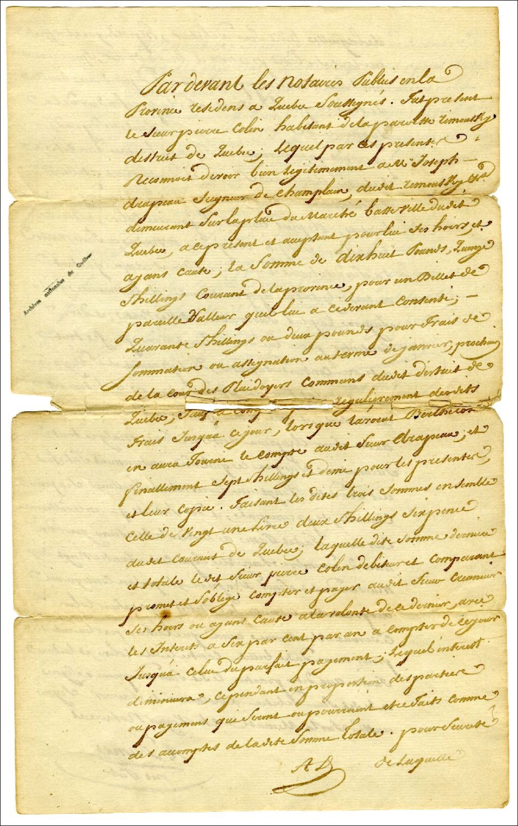 Obligation de Pierre Colin de Rimousky [sic] de L.21.2.6. Cour de Québec en faveur de Joseph Drapeau