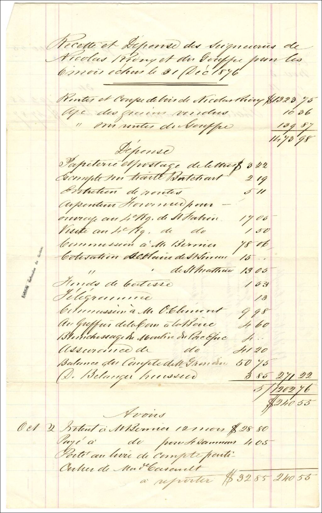 Réddition de comptes par E. [Edouard] Lemoine ou recette des seigneuries Nicolas Rioux et du Gouffre pour les six mois terminés le 31 décembre 1876, 16 janvier 1877, Archives nationales à Rimouski, Fonds Famille Tessier, (01R,P1,S10,P191).