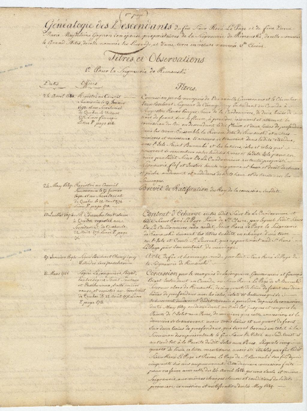 Généalogie des descendants du feu Sieur René Lepage et de Dame Magdeleine Gagnon, son épouse, propriétaires de la Seigneurie de Rimouski, de celle nommée le Grand Mitis, de celle nommée les Lessards, et d'une terre en roture nommée Sainte-Claire