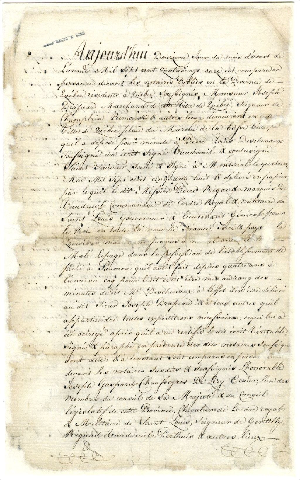 Copie, à la demande de Joseph Drapeau, de l'acte de dépôt d'un ordre de Pierre Rigaud Marquis de Vaudreuil, Gouverneur de la Nouvelle France, qui maintient les Molé Lepage en possession de l'établissement de pêche aux saumons de l'Anse aux Coqs, 12 août 1791, Archives nationales à Rimouski, Fonds Famille Tessier, (01R,P1,S10,P201).