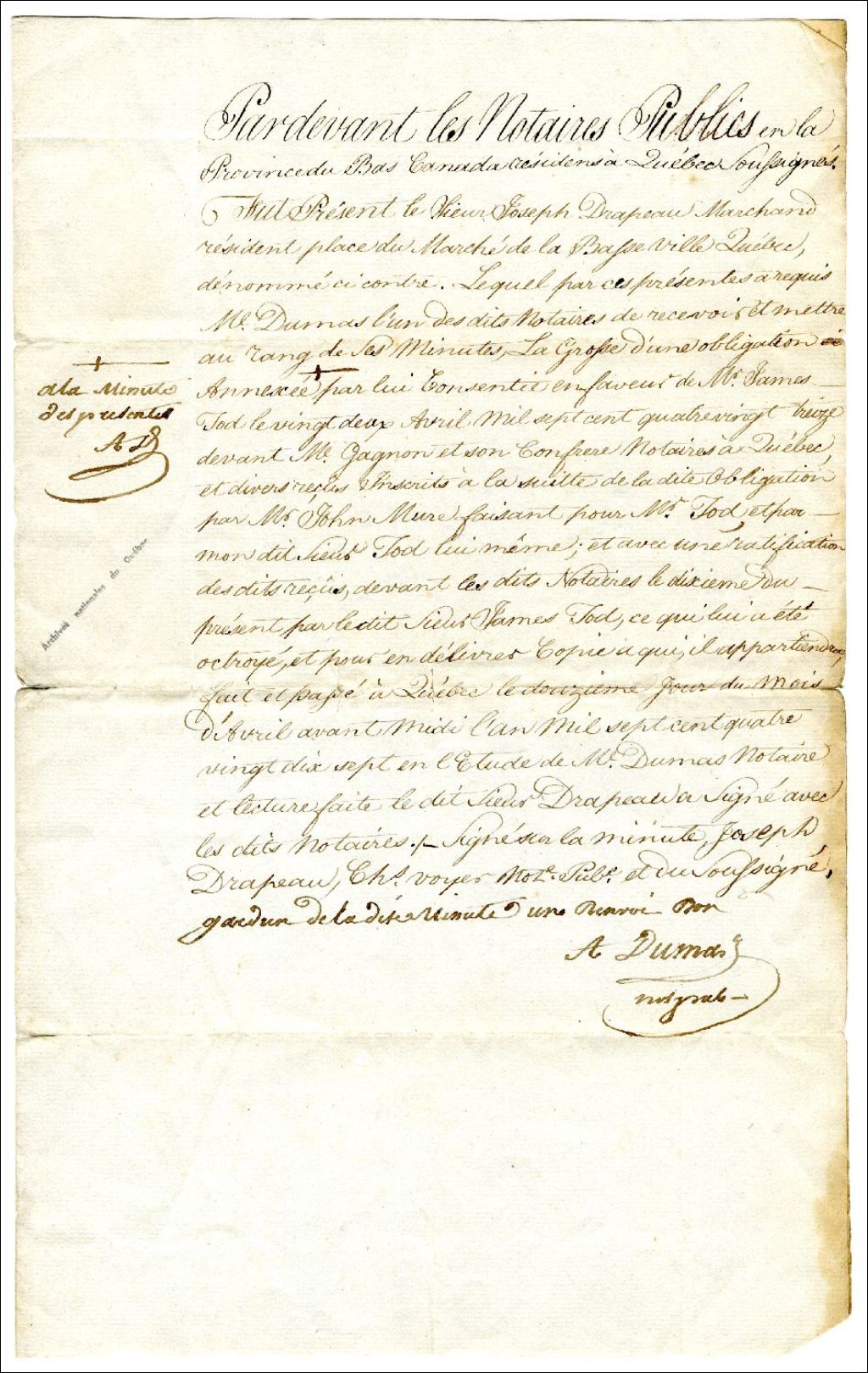 Obligation de Joseph Drapeau en faveur de James Tod, 12 avril 1797, Archives nationales à Rimouski, Fonds Famille Tessier, (01R,P1,S10,P50).
