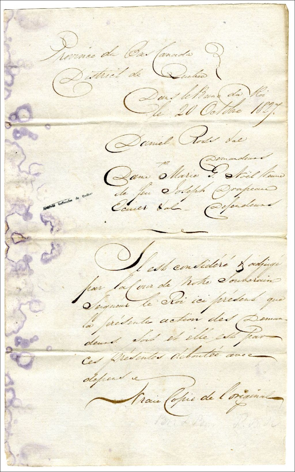 Jugements déboutant l'action en justice de Daniel Ross & al. contre Marie-Geneviève Noël, veuve de Joseph drapeau & al. réclamant la seigneurie de Lepage et Thibièrge, 20 octobre 1827, Archives nationales à Rimouski, Fonds Famille Tessier, (01R,P1,S10,P87).