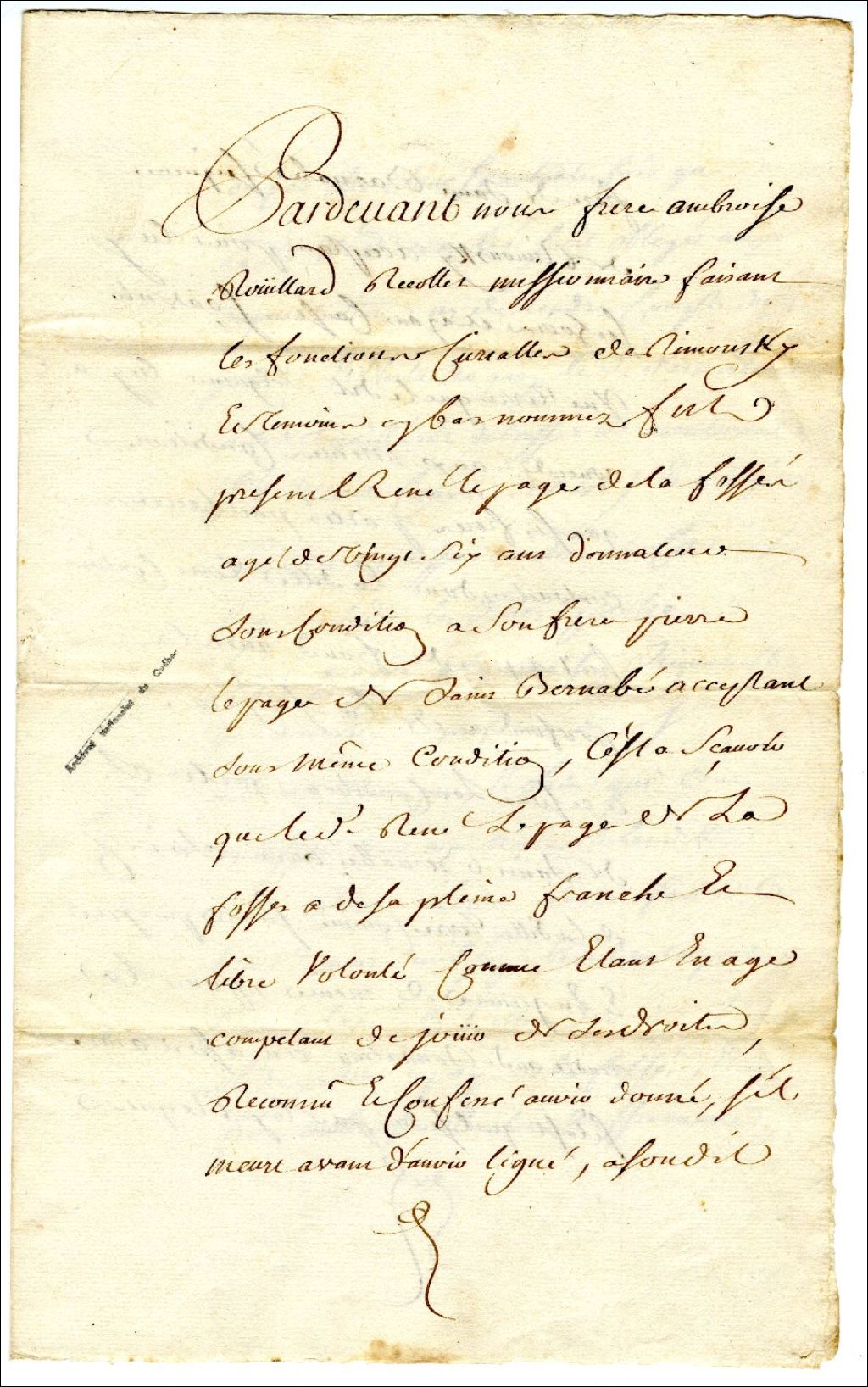Donation de René Lepage de la Fosse à son frère Pierre Lepage de Saint-Barnabé, le 12 octobre 1734