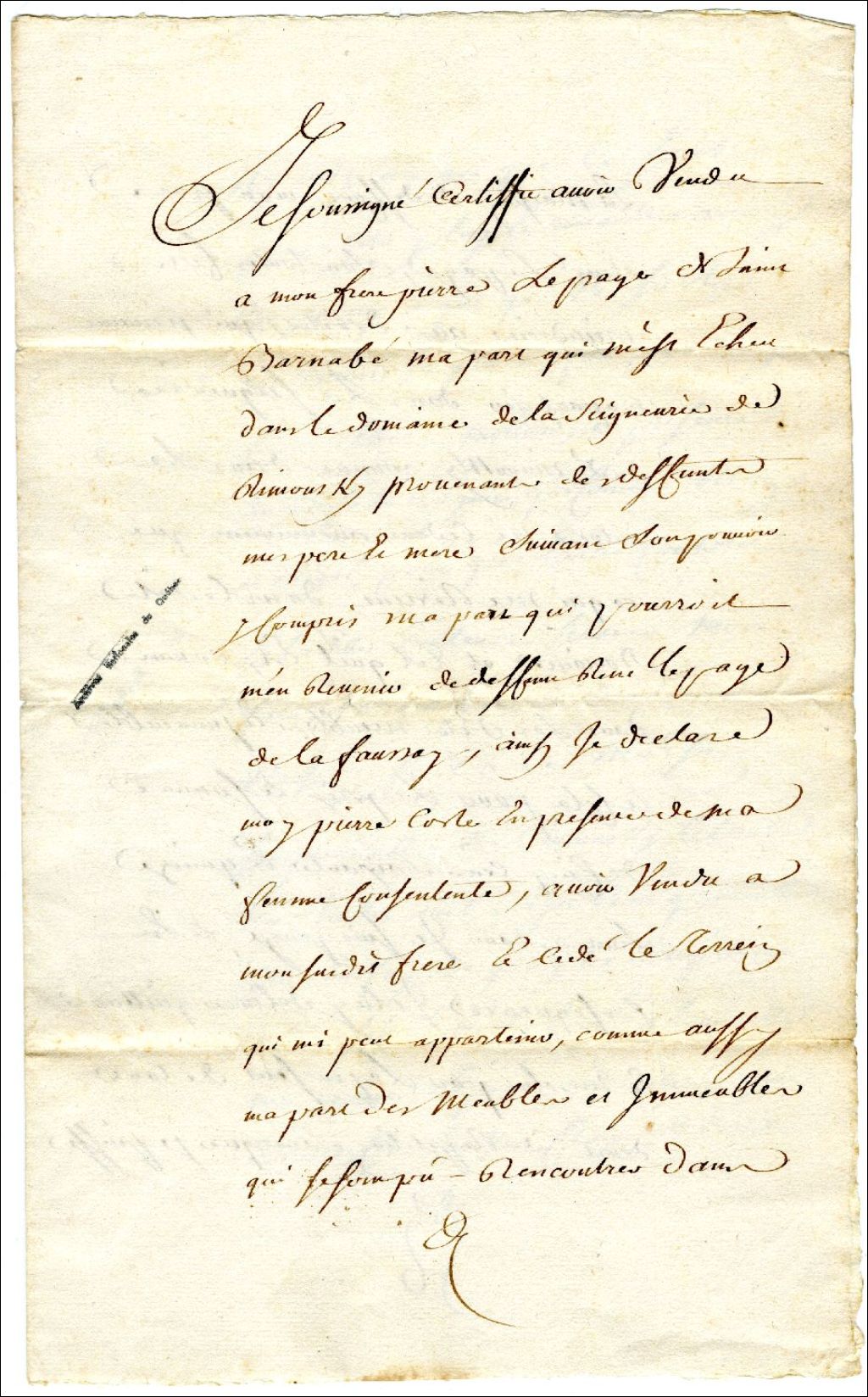 Vente par Pierre Costé à Pierre Lepage de Saint-Barnabé de sa part dans le domaine de la seigneurie de Rimousky [sic]