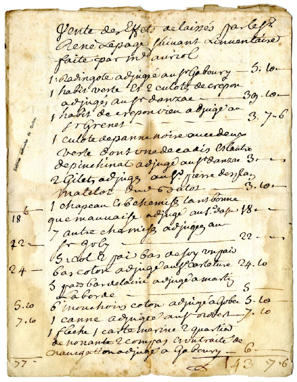 Vente des effets délaissés par René Lepage suivant l'inventaire faite par M. Auriol, [entre 1695 et 1790], Archives nationales à Rimouski, Fonds Famille Tessier, (01R,P1,S11,P3).