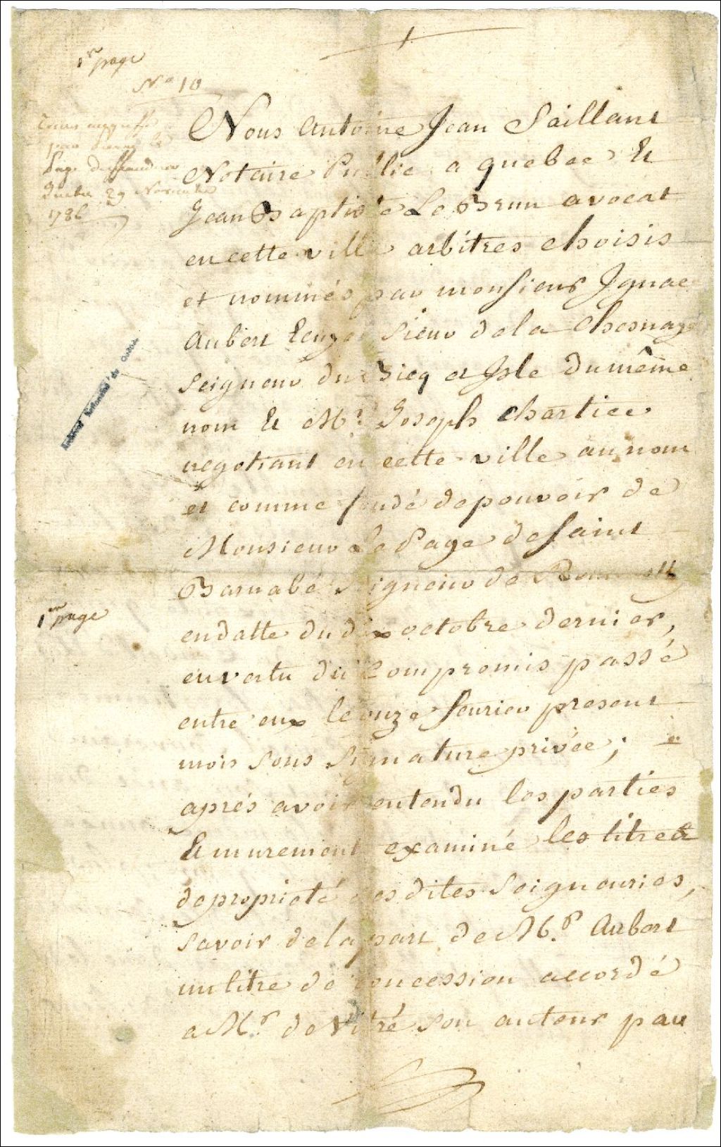 Jugement concernant la délimitation des seigneuries du Bic et de Rimouski, 12 février 1765, Archives nationales à Rimouski, Fonds Famille Tessier, (01R,P1,S11,P30).
