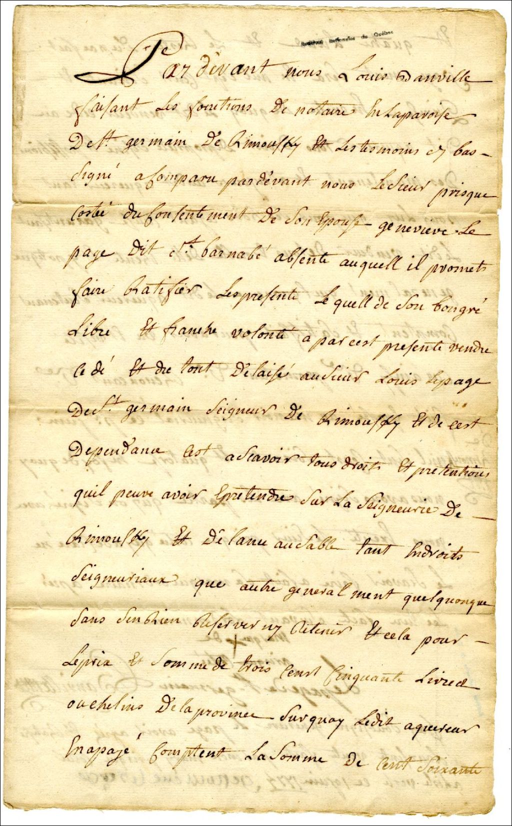 Vente de Prisque Costée, époux de Geneviève Lepage dit Saint-Barnabé à Louis Lepage de Saint-Germain, 1 juin 1774, Archives nationales à Rimouski, Fonds Famille Tessier, (01R,P1,S11,P37).