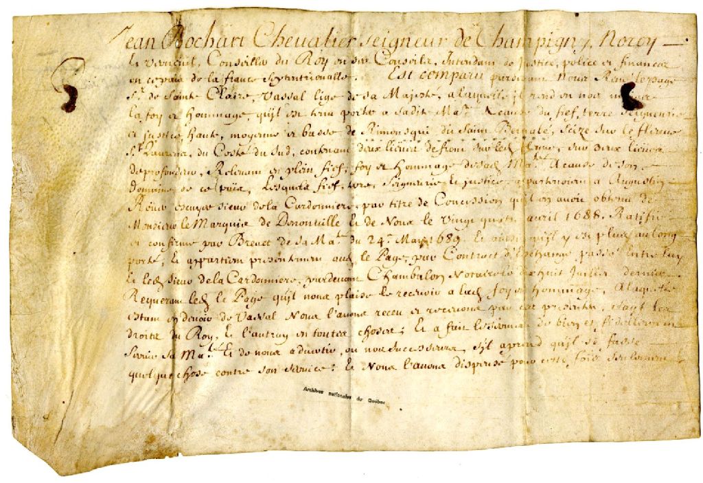 Foy [Foi] et hommages de René Lepage de Sainte-Claire pour la seigneurie de Rimouski, 1695, Archives nationales à Rimouski, Fonds Famille Tessier, (01R,P1,S11,P4).