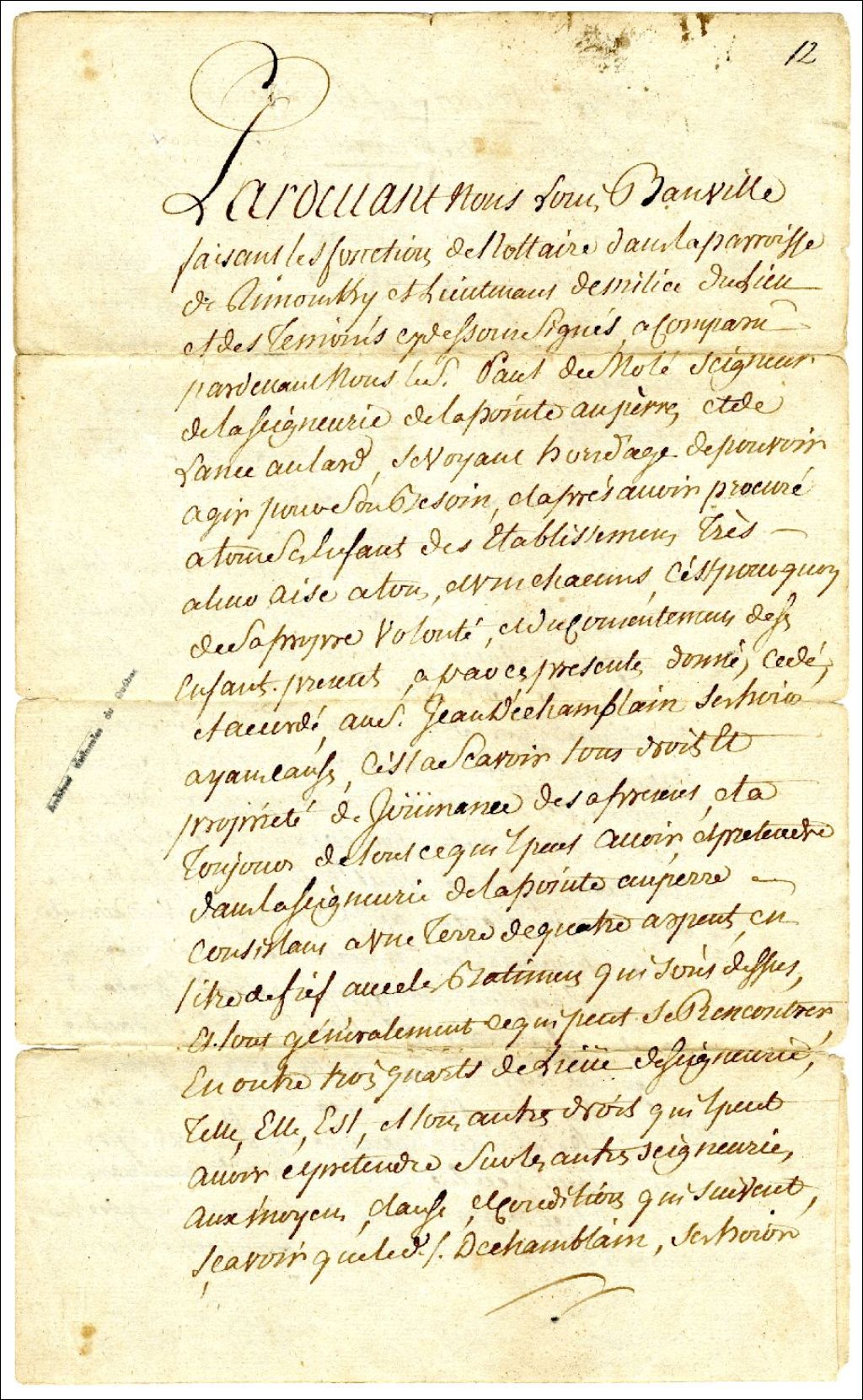 Copie collationnée de l'acte de donation de Paul De Mole à Jean Dechamplain, 20 septembre 1783 (original créé le 29 octobre 1781), Archives nationales à Rimouski, Fonds Famille Tessier, (01R,P1,S11,P49).