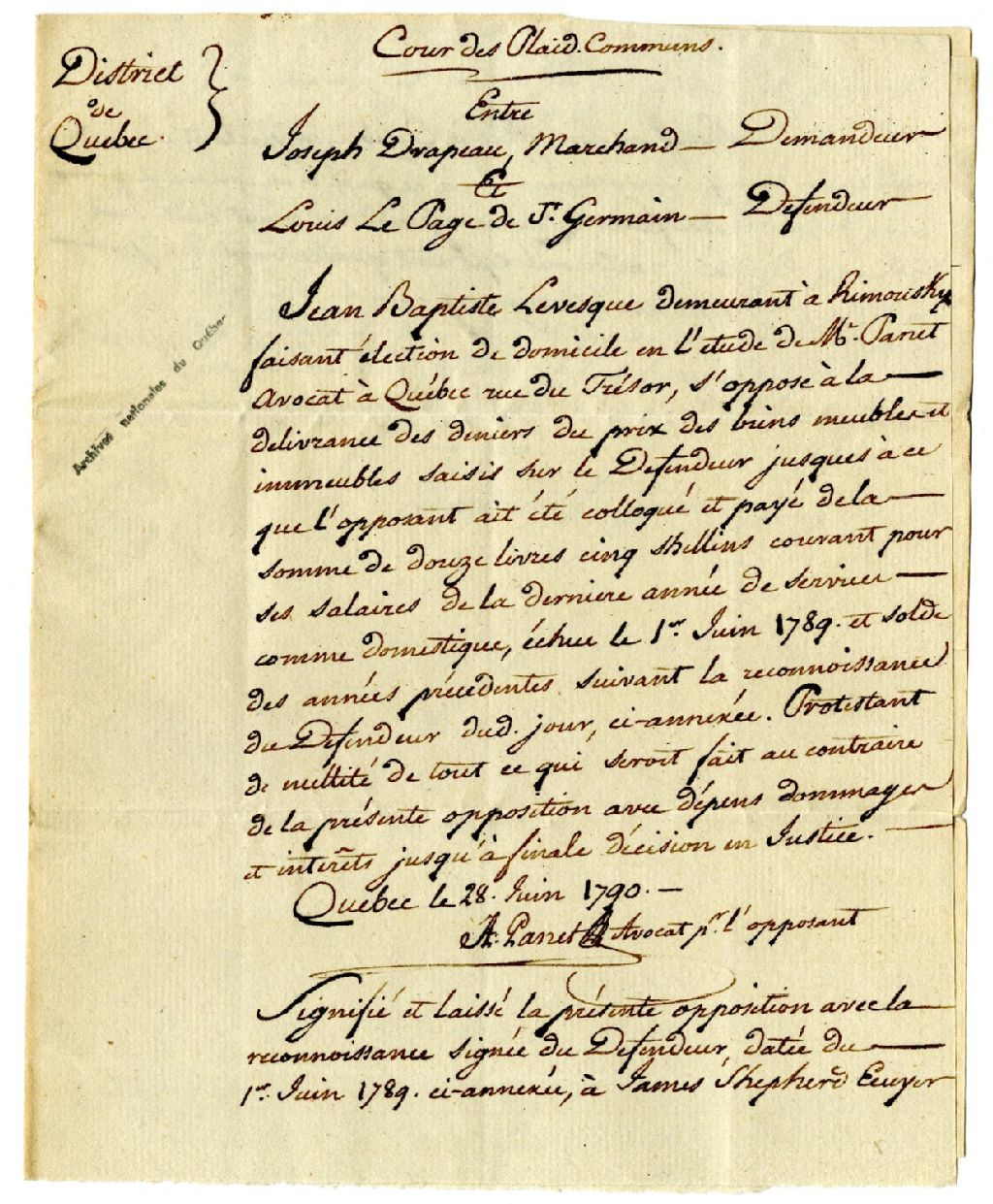 Cour de plaidoyers Communs entre Joseph Drapeau, marchand, demandeur et Louis Lepage de Saint-Germain, défendeur, 28 juin 1790, Archives nationales à Rimouski, Fonds Famille Tessier, (01R,P1,S11,P54).