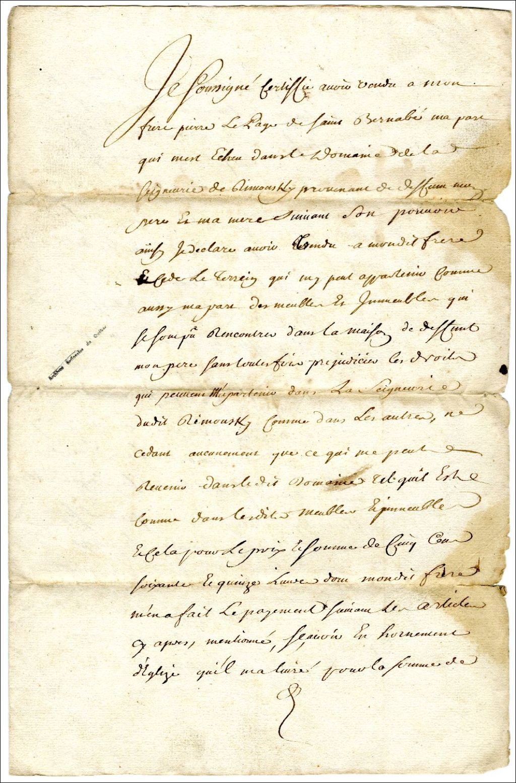 Copie collationnée de la vente de droits par Nicolas Lepage de la Fausse à son frère Pierre Lepage de Saint-Barnabé, 2 octobre 1738, Archives nationales à Rimouski, Fonds Famille Tessier, (01R,P1,S11,P67).