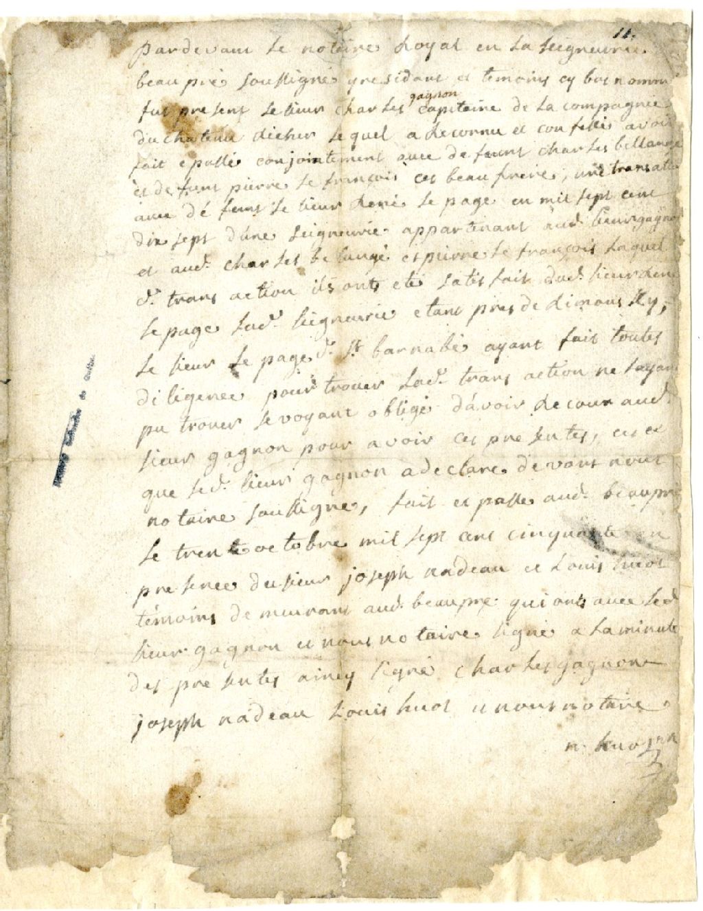 Déclaration de Charles Gagnon portant que lui, Charles Bellanger et Pierre Lefrançois ont fait un transaction avec René Lepage en 1717 au sujet d'un seigneurie auprès de Rimousky [sic], dont ils ont été satisfait, laquelle transaction ne peut être trouvée