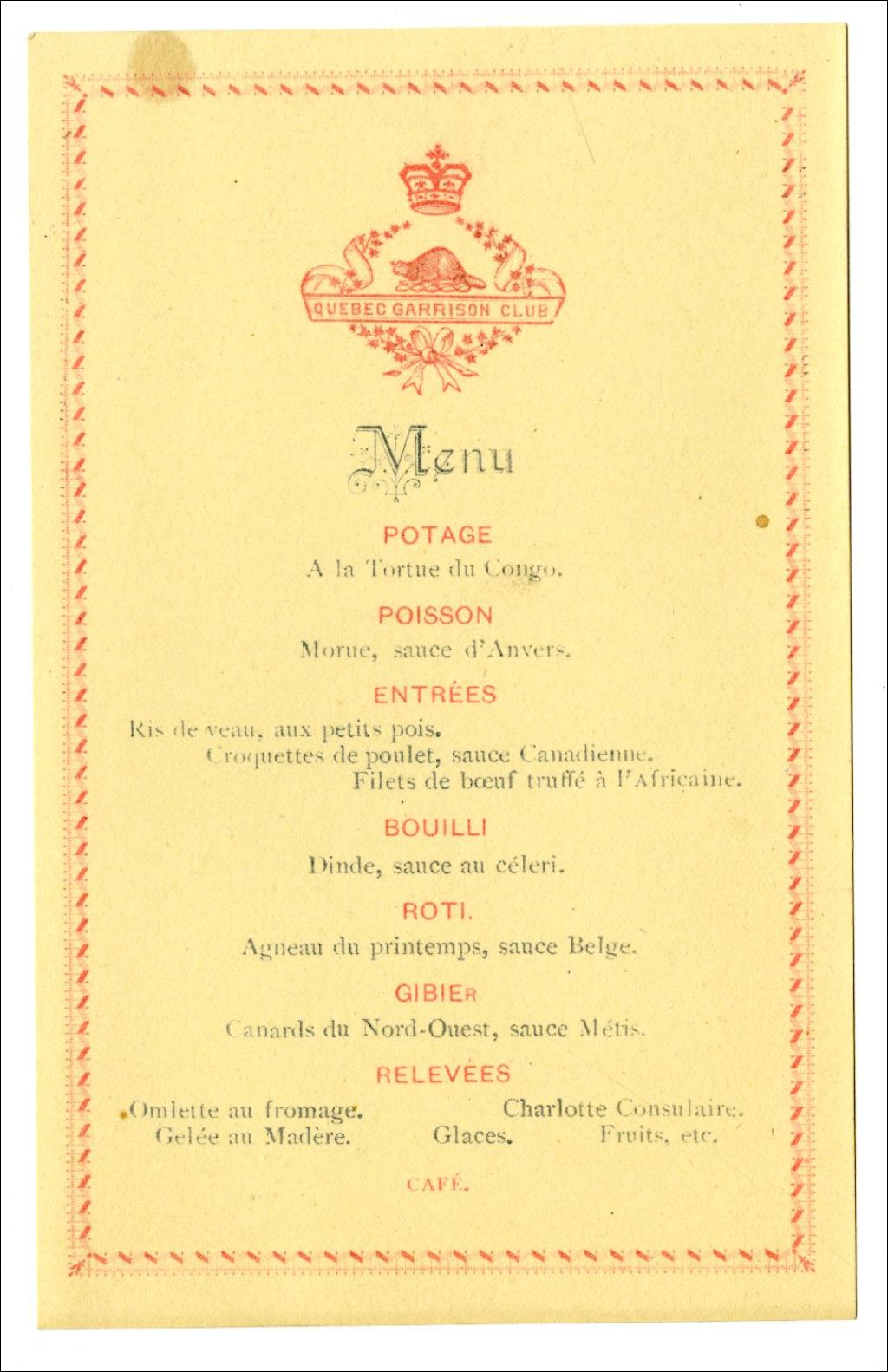 Menu du diner donné en l'honneur de M. Janssen, consul général de Belgique, 12 mai 1885, Archives nationales à Rimouski, Fonds Famille Tessier, (01R,P1,S1,SS1,P106).