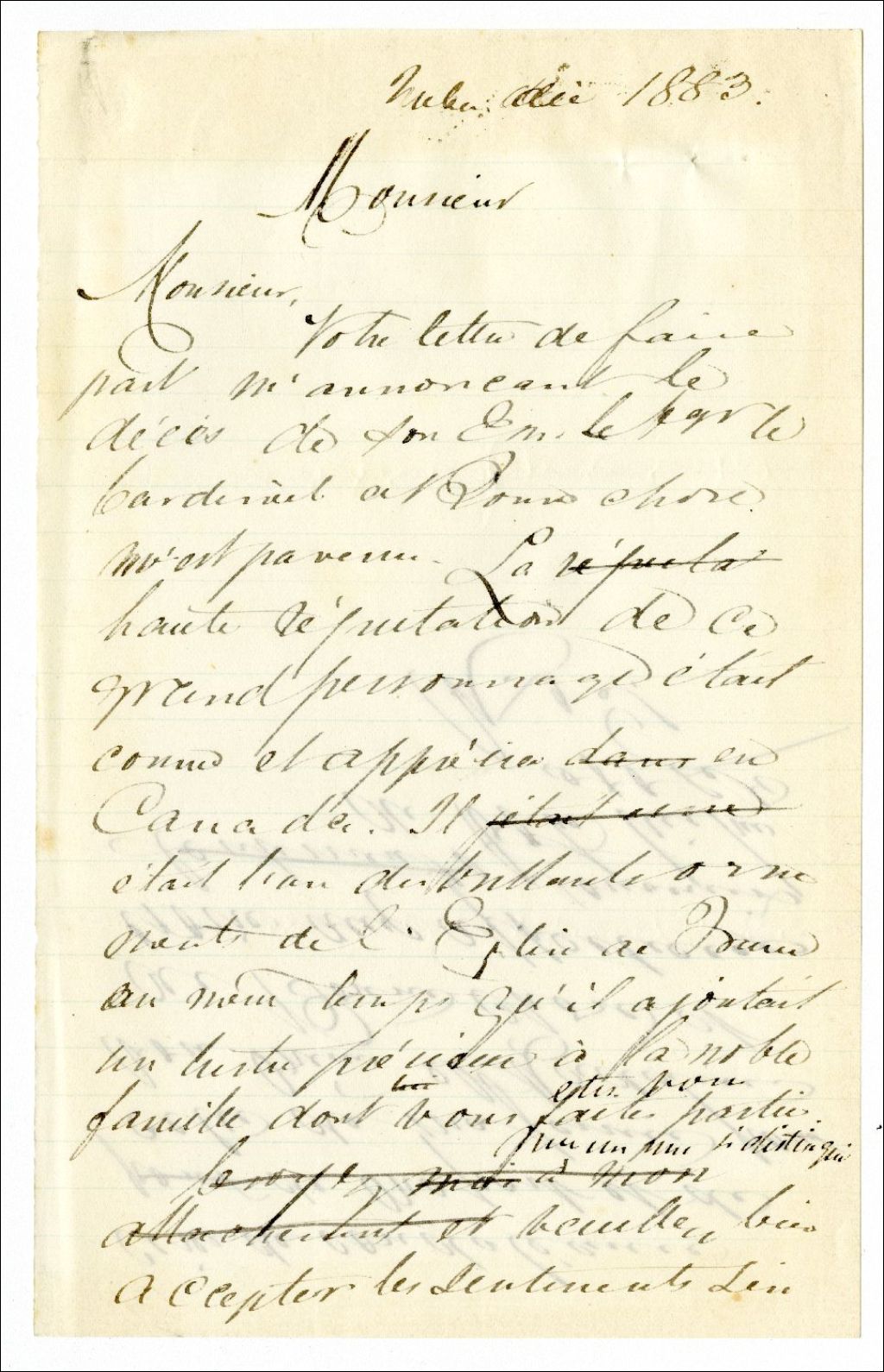 Lettre d'Ulric-Joseph Tessier concernant le décès de Mgr Henri Marie Gaston de Bonnechose, Cardinal, prêtre, archevêque de Rouen, Primat de Normandie, décembre 1883, Archives nationales à Rimouski, Fonds Famille Tessier, (01R,P1,S1,SS1,P96).