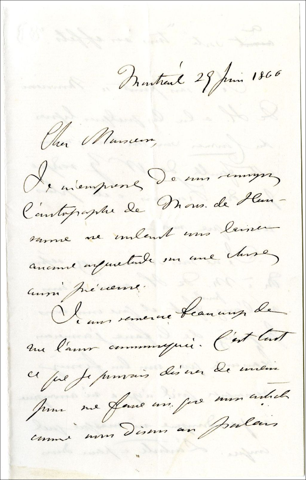 Lettre de Pierre-Joseph-Olivier Chauveau à Ulric-Joseph Tessier, 29 juin 1866, Archives nationales à Rimouski, Fonds Famille Tessier, (01R,P1,S1,SS2,P212).