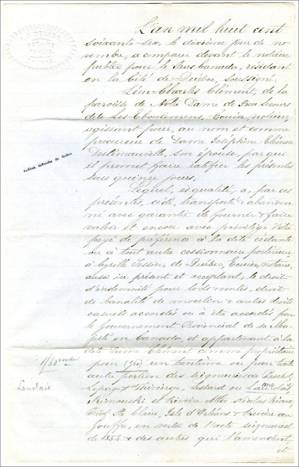 Indemnité seigneuriale - Transport de terre par L.C. Clément procureur de son épouse à Cyrille Tessier