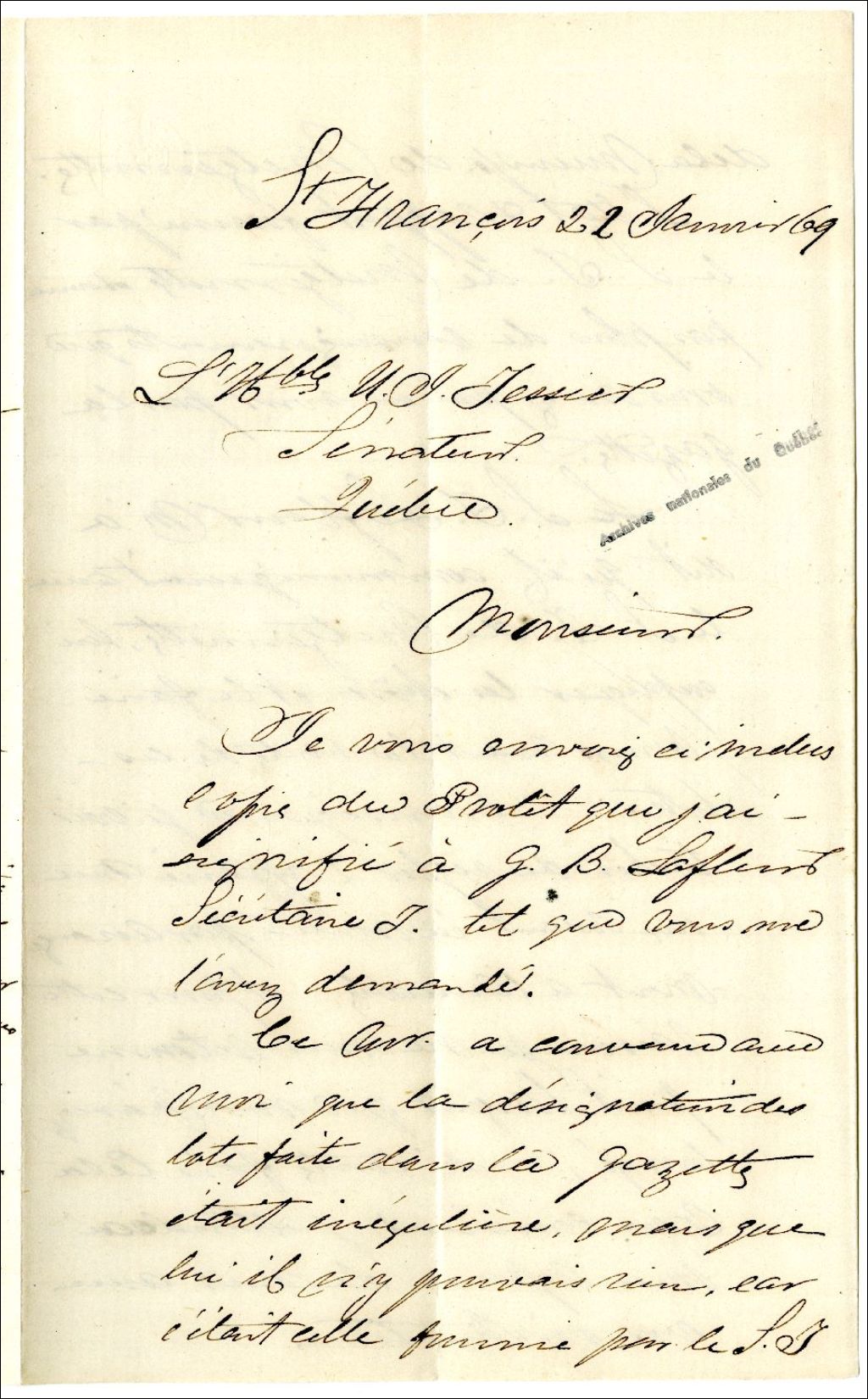 - Lettre du notaire J. E. Proux concernant un protêt sur la vente de lots de terre