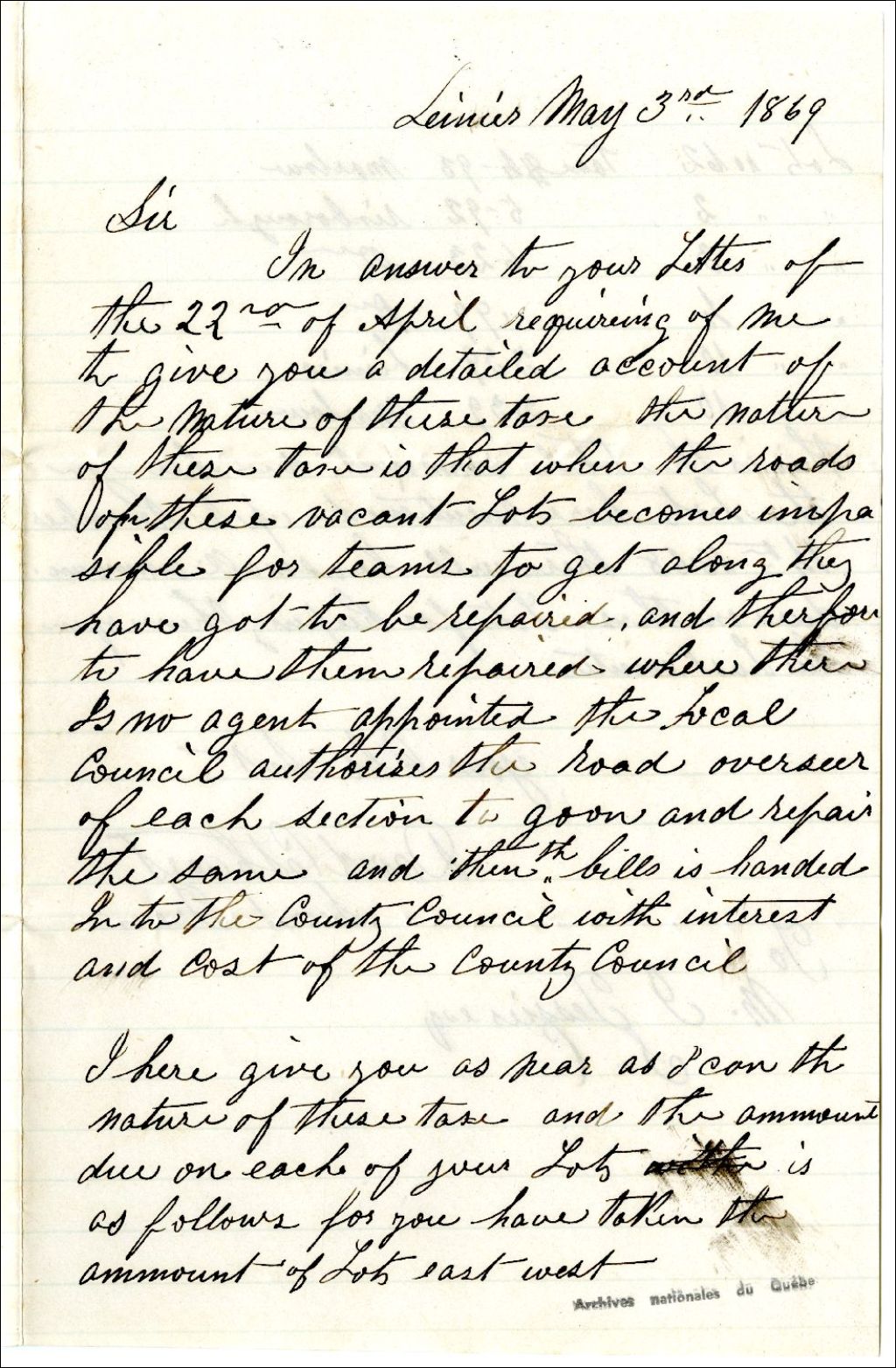 Lettre de David Cathcart concernant la taxe sur ses lots de terre, 3 mai 1869, Archives nationales à Rimouski, Fonds Famille Tessier, (01R,P1,S1,SS2,P261).