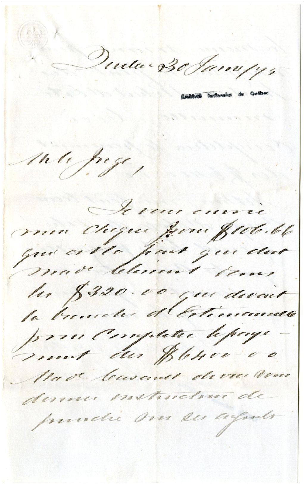 Lettre de E. [Edouard] LeMoine à Ulric-Joseph Tessier, 30 janvier 1875, Archives nationales à Rimouski, Fonds Famille Tessier, (01R,P1,S1,SS2,P286).